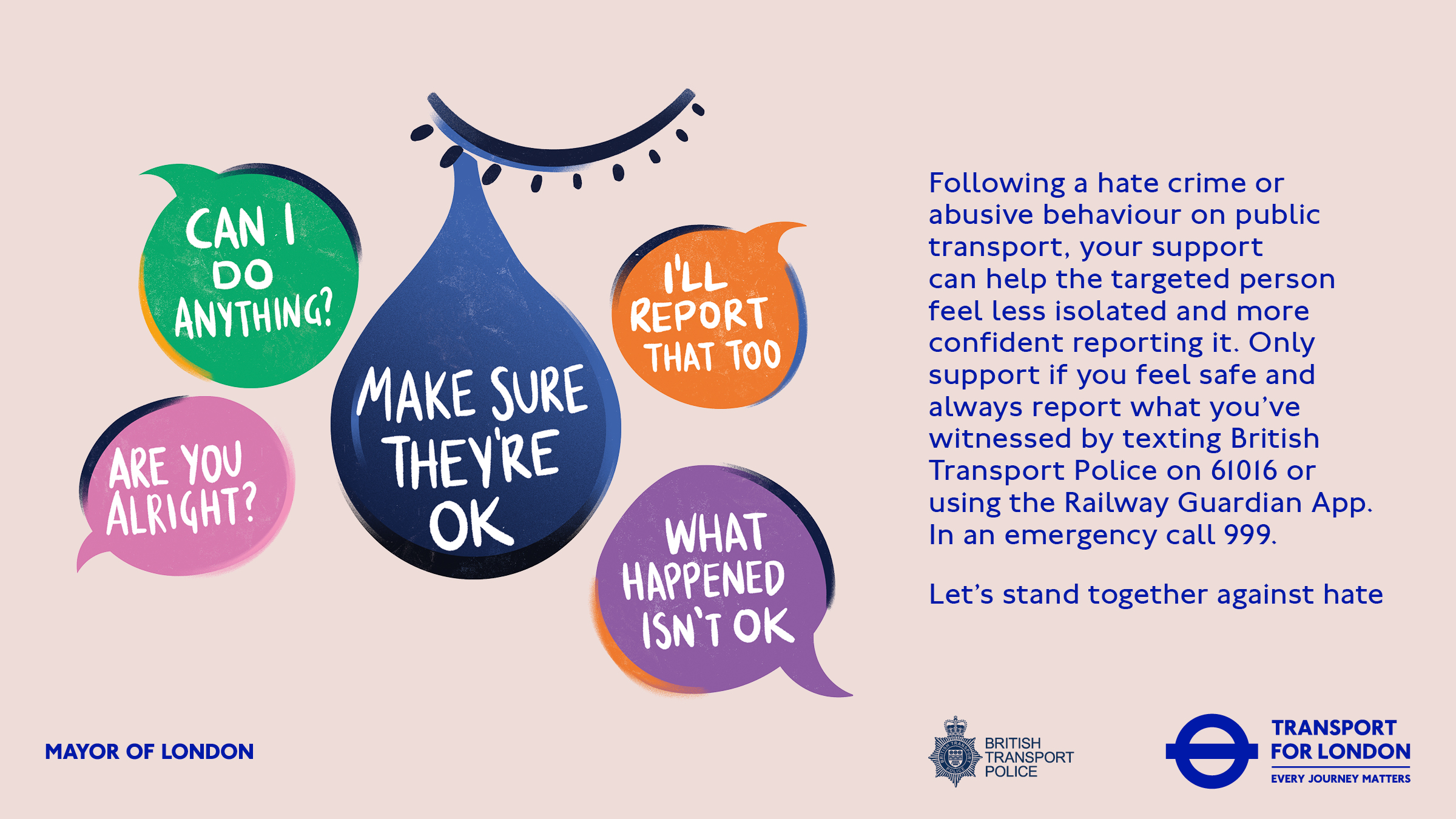 Alongside the iconic TfL branding, the creative also utilises the same colour palette and similar illustrative style to the existing ‘Stands against Hate’ campaign to ensure consistency and connection between the two.